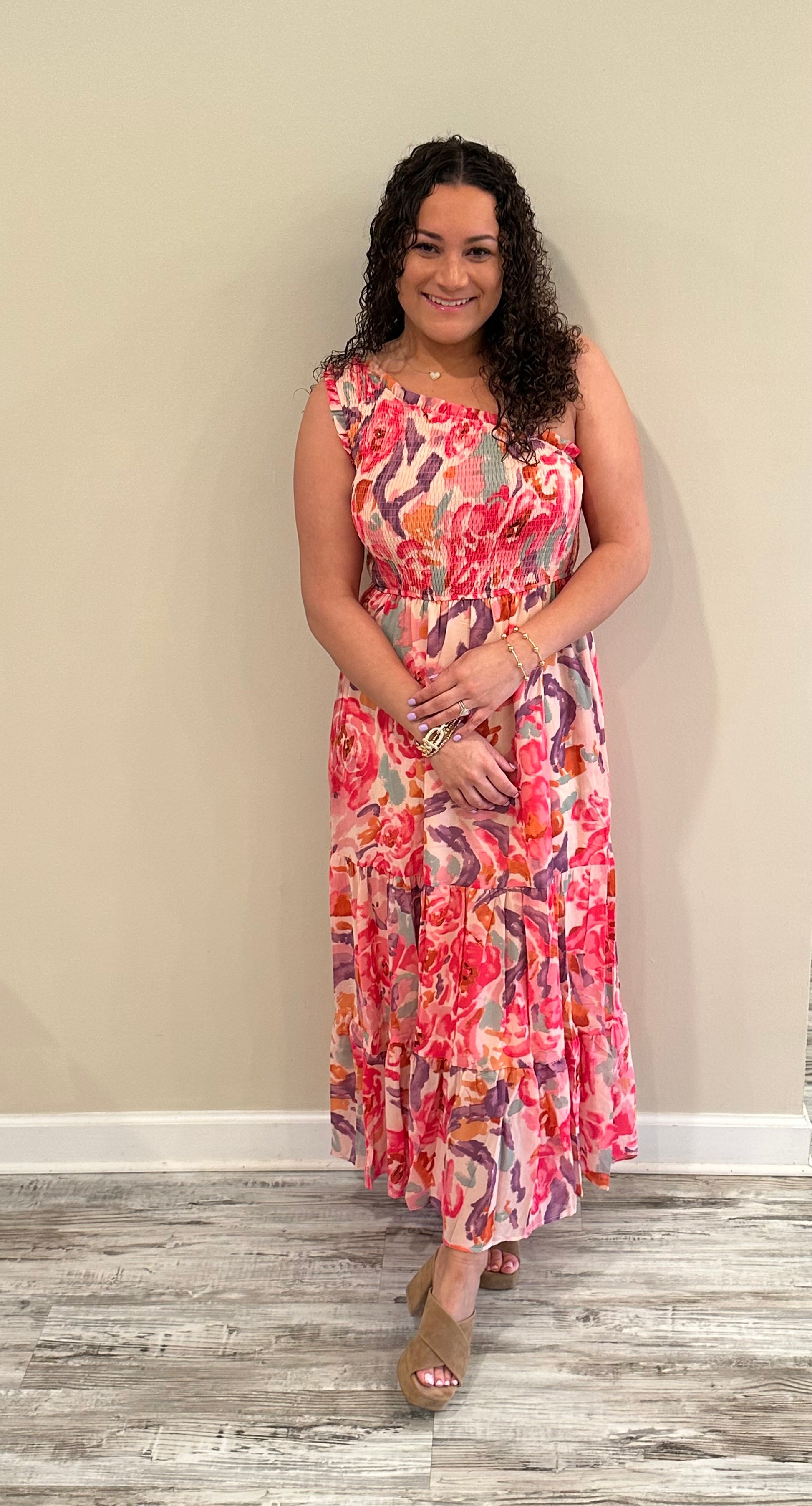- Add texture and detail with the flattering smocked panel.